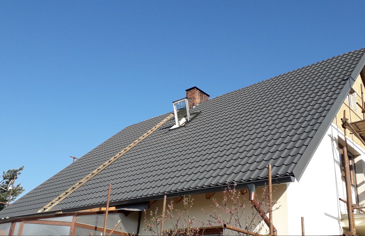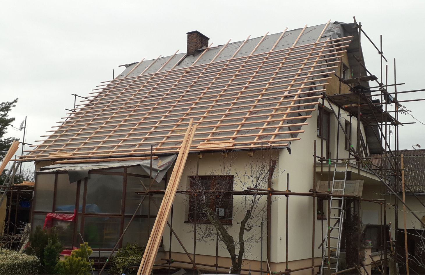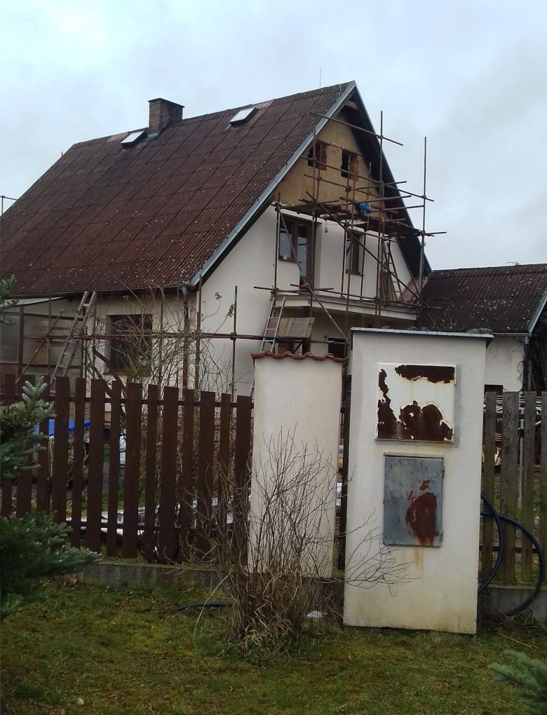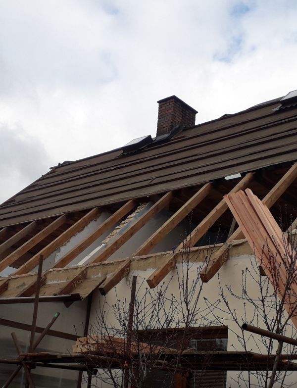 02 - pohled na dům z příjezdové komunikace se započatou rekonstrukcí střešní krytiny a odhalení nosných konstrukcí